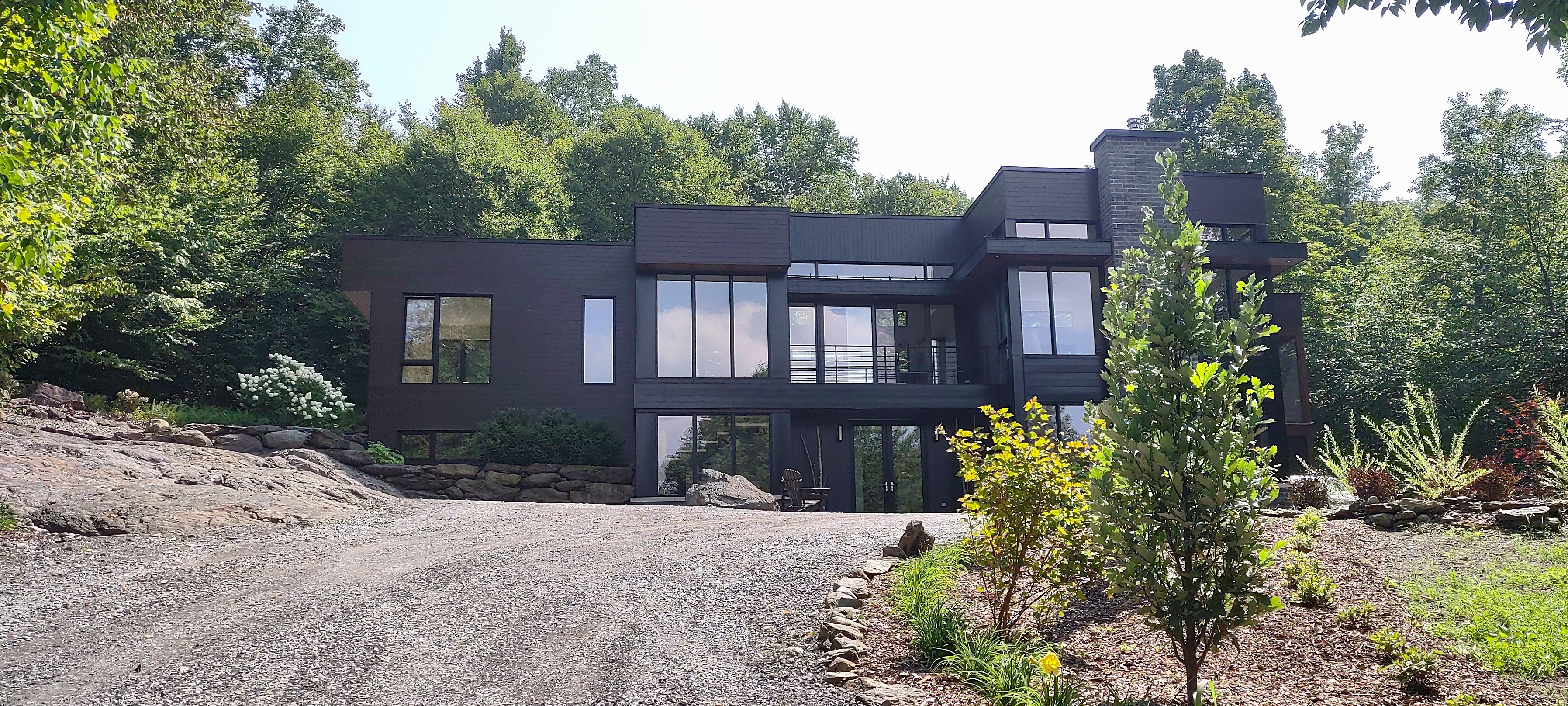 L’aménagement a été réfléchi afin que la résidence contemporaine s’intègre avec harmonie dans son milieu naturel caractérisé par ses paliers. En façade et le long de l’allée automobile, les plantations viennent à la fois accompagner l’architecture et souligner la présence du cap rocheux qui domine le site. Le port élancé du chêne colonnaire structure l’espace et guide le regard, tandis que le diervilla et les hémérocalles apportent texture, couleurs et floraisons saisonnières, contribuant à renforcer l’équilibre subtil entre bâti et paysage.